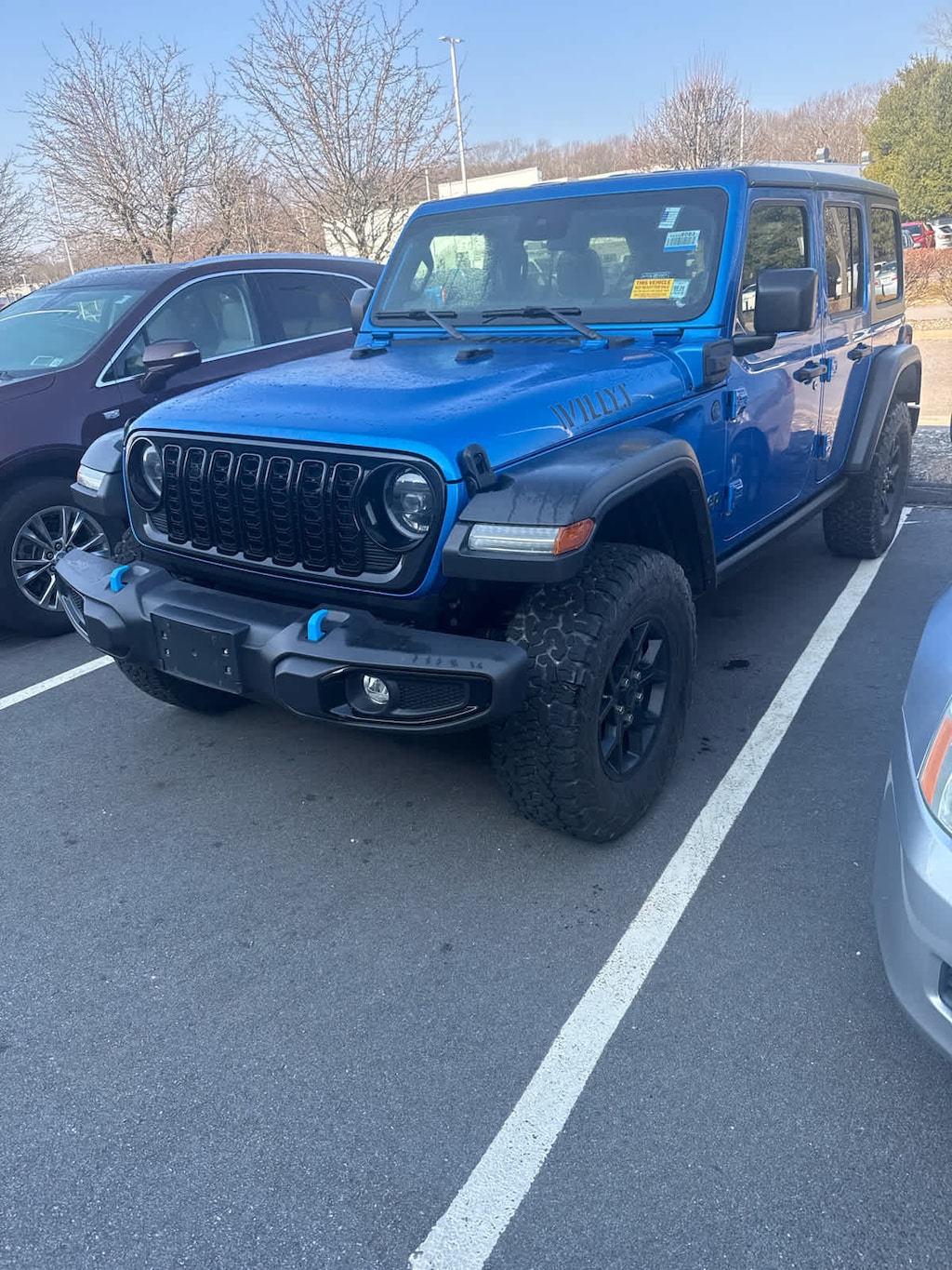 QUICK ORDER PACKAGE 29W WILLYS Engine: 2.0L I4 DOHC DI Turbo PHEV, Transmission: 8-Speed Auto 8P75PH PHEV, Willys, 4xe 4-Wheel Drive Swing Gate Decal, 7 & 4 Pin Wiring Harness, Willys 4xe Hood Decal, Conventional Differential Front Axle, Off-Road Plus Mode, Black Grille, Rock Protection Sill Rails, 97 MPH Vehicle Max Speed Calibration, Front LED Fog Lamps, LED Premium Reflector Headlamps, Auxiliary Switches, E-Locker Rear Axle, Molded in Color Rubicon Highline Flare, CONVENIENCE GROUP Emergency/Assistance Call, 2-Door Passive Entry, Front Door Locks, Remote Start System, Universal Garage Door Opener, Heated Front Seats, Heated Steering Wheel, BLACK 3-PIECE HARD TOP Freedom Panel Storage Bag, Rear Window Defroster, Rear Window Wiper/Washer, No Soft Top, MOPAR HARDTOP HEADLINER, HYDRO BLUE PEARLCOAT, TRANSMISSION: 8-SPEED AUTO 8P75PH PHEV (STD), ENGINE: 2.0L I4 DOHC DI TURBO PHEV (STD).